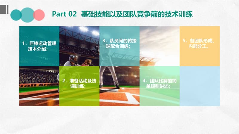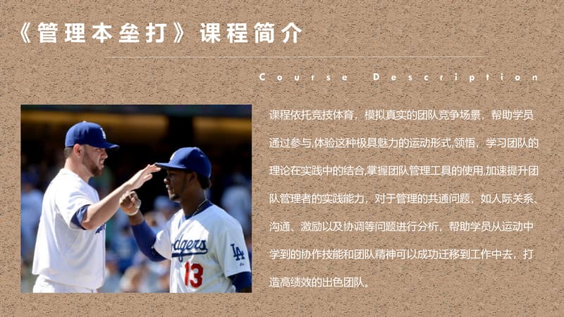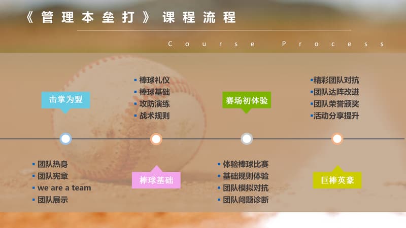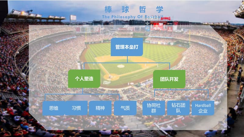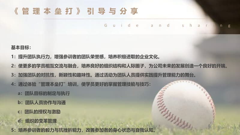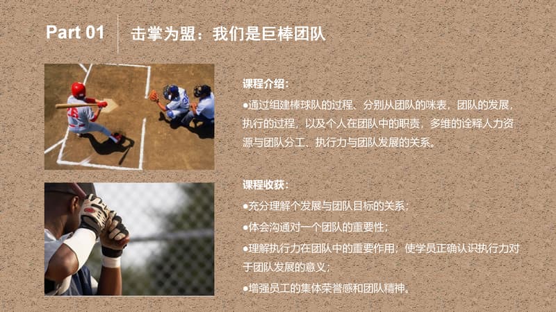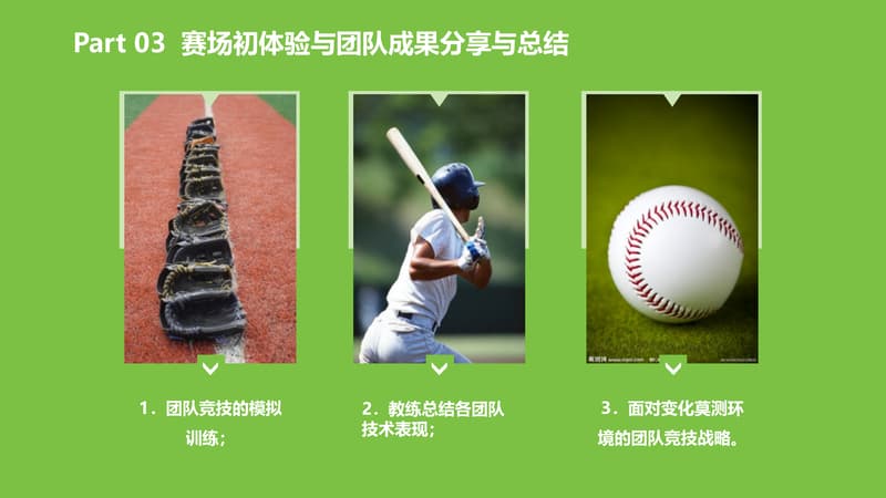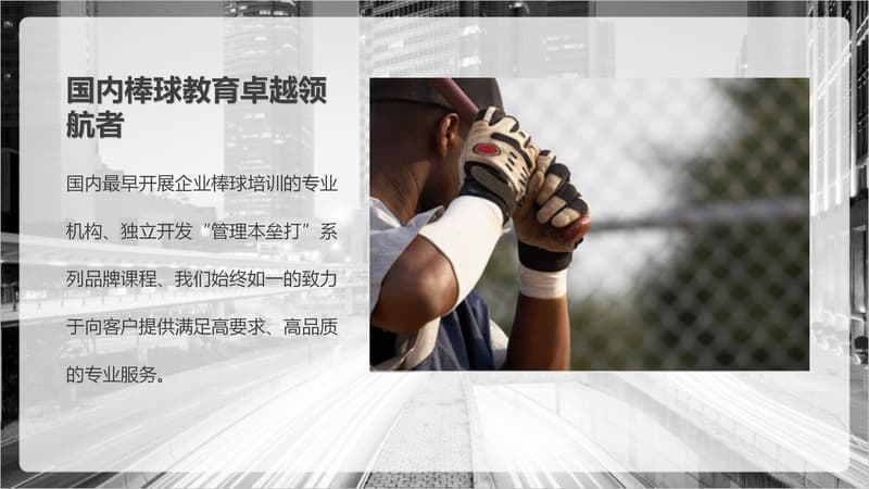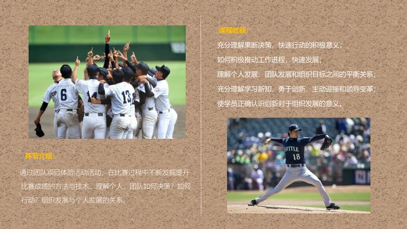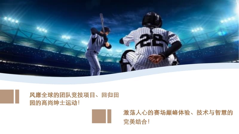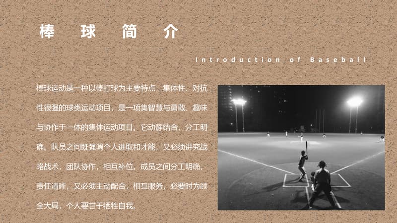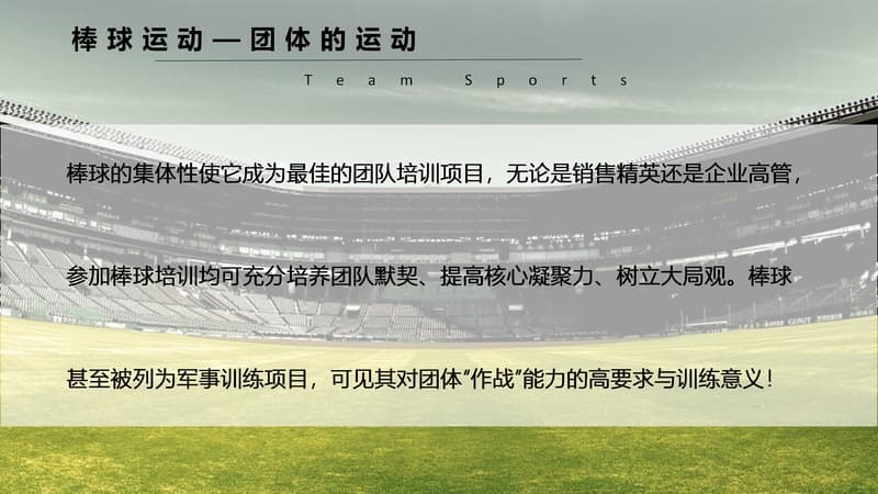 棒球运动是一种以棒打球为主要特点,集体性、对抗性很强的球类运动项目,是一项集智慧与勇敢、趣味与协作于一体的集体运动项目。它动静结合,分工明确。队员之间既强调个人进取和才能,又必须讲究战略战术,团队协作,相互补位。成员之间分工明确,责任清晰,又必须主动配合,相互服务,必要时为顾全大局,个人要甘于牺牲自我。