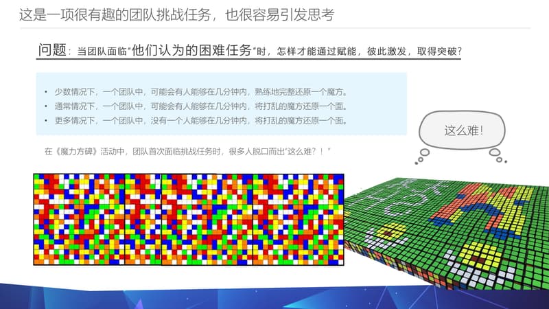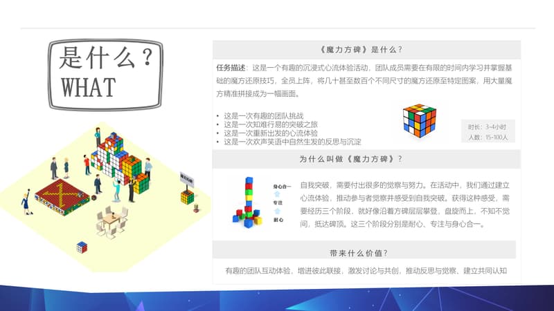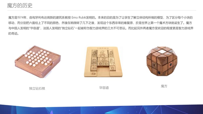 魔方是1974年,由匈牙利布达佩斯的建筑系教授 Erno Rubik发明的。本来的目的是为了让学生了解立体结构所做的模型,为了区分每个小块的移动,而分别把六面给上了不同的颜色,然後在稍微转了几下之後,发现这个东西非常的难复原,於是世界上第一个魔术方块就诞生了。魔方与中国人发明的“华容道”,法国人发明的“独立钻石”一起被称为智力游戏界的三大不可思议。而比起另外两者魔方受欢迎的程度更是智力游戏界的奇迹...