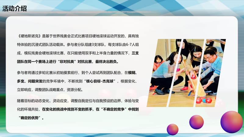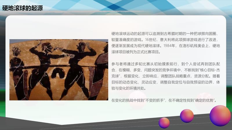 硬地滚球运动的起源可以追溯到古希腊时期的一种把球掷向圆圈、较量准确度的游戏。16世纪,意大利将此项掷球游戏进行了改进,便逐渐发展成为现代硬地滚球。1984年,在洛杉矶残奥会上,硬地滚球项目被列为正式比赛项目。