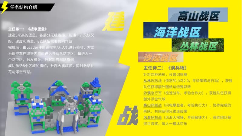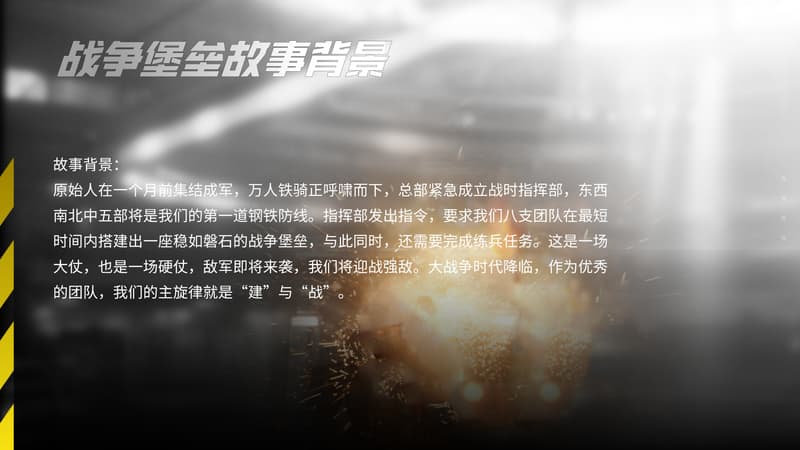 原始人在一个月前集结成军,万人铁骑正呼啸而下,总部紧急成立战时指挥部,东西南北中五部将是我们的第一道钢铁防线。指挥部发出指令,要求我们八支团队在最短时间内搭建出一座稳如磐石的战争堡垒,与此同时,还需要完成练兵任务。这是一场大仗,也是一场硬仗,敌军即将来袭,我们将迎战强敌。大战争时代降临,作为优秀的团队,我们的主旋律就是“建”与“战”。