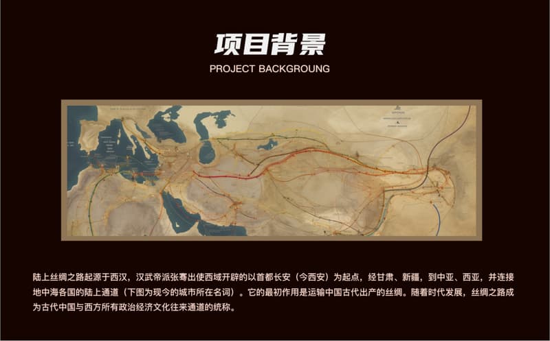 陆上丝绸之路起源于西汉,汉武帝派张骞出使西域开辟的以首都长安(今西安)为起点,经甘肃、新疆,到中亚、西亚,并连接地中海各国的陆上通道(下图为现今的城市所在名词)。它的最初作用是运输中国古代出产的丝绸。随着时代发展,丝绸之路成为古代中国与西方所有政治经济文化往来通道的统称。