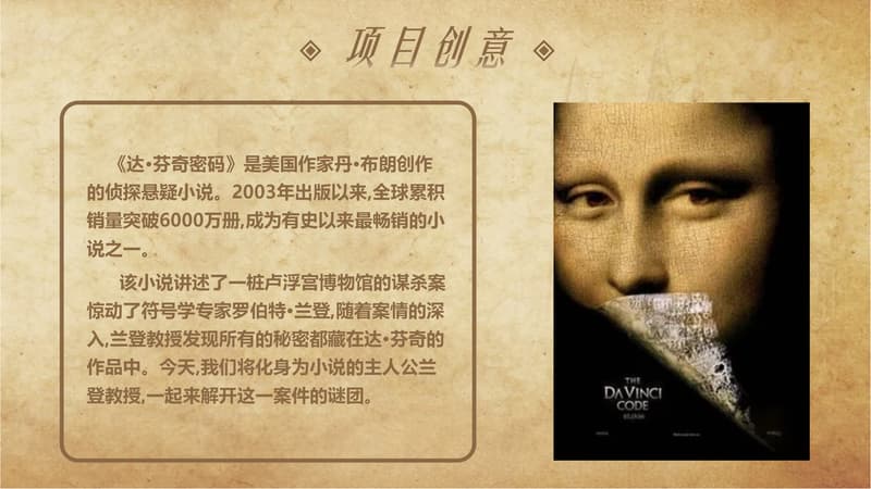 《达·芬奇密码》是美国作家丹·布朗创作的侦探悬疑小说。2003年出版以来,全球累积销量突破6000万册,成为有史以来最畅销的小说之一。 该小说讲述了一桩卢浮宫博物馆的谋杀案惊动了符号学专家罗伯特·兰登,随着案情的深入,兰登教授发现所有的秘密都藏在达·芬奇的作品中。今天,我们将化身为小说的主人公兰登教授,一起来解开这一案件的谜团。