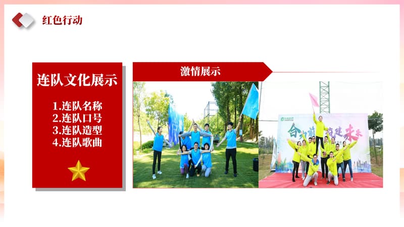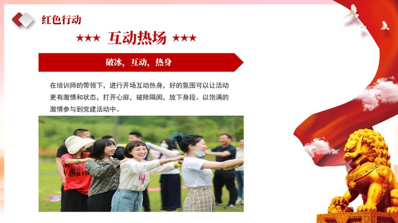 在培训师的带领下,进行开场互动热身,好的氛围可以让活动更有激情和状态,打开心扉,破除隔阂,放下身段。以饱满的激情参与到党建活动中。