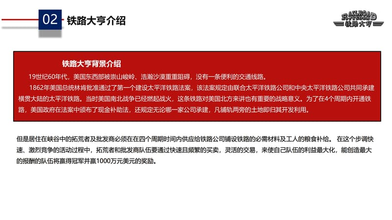 19世纪60年代,美国东西部被崇山峻岭、浩瀚沙漠重重阻碍,没有一条便利的交通线路。 1862年美国总统林肯批准通过了第一个建设太平洋铁路法案,该法案规定由联合太平洋铁路公司和中央太平洋铁路公司共同承建横贯大陆的太平洋铁路。当时美国南北战争已经燃起战火,这条铁路对美国北方来讲也有重要的战略意义。为了在4个周期内开通铁路,美国政府在法案中颁布了现金补助法,还规定无论哪一家公司承建,凡铺轨两旁的土地即归...
