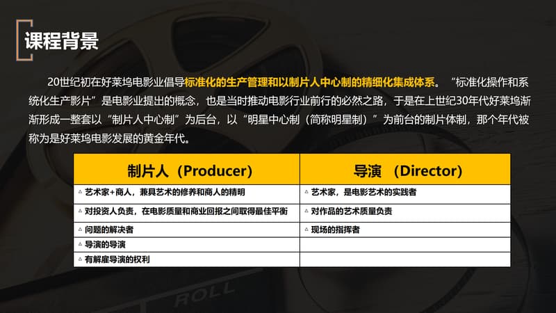 20世纪初在好莱坞电影业倡导标准化的生产管理和以制片人中心制的精细化集成体系。“标准化操作和系统化生产影片”是电影业提出的概念,也是当时推动电影行业前行的必然之路,于是在上世纪30年代好莱坞渐渐形成一整套以“制片人中心制”为后台,以“明星中心制(简称明星制)”为前台的制片体制,那个年代被称为是好莱坞电影发展的黄金年代。