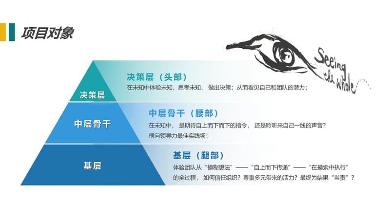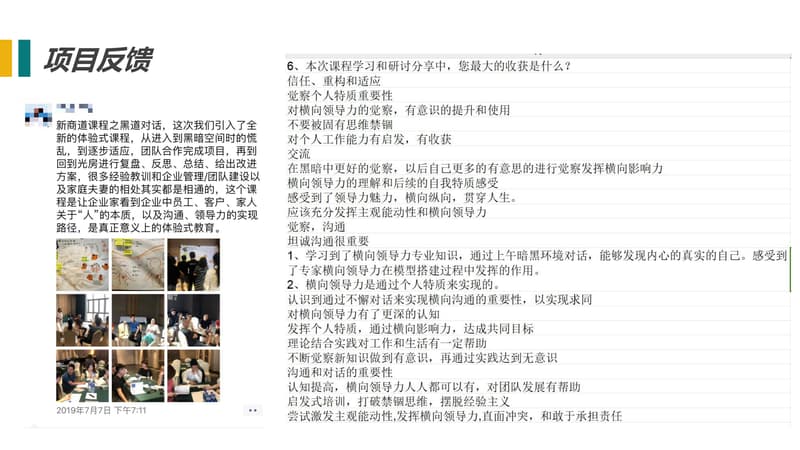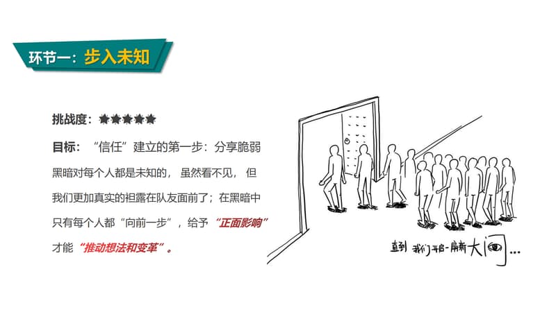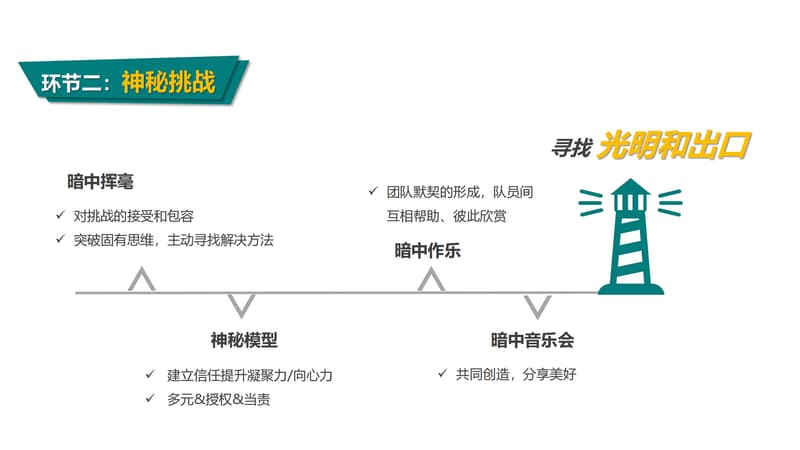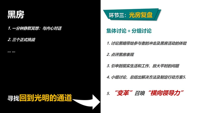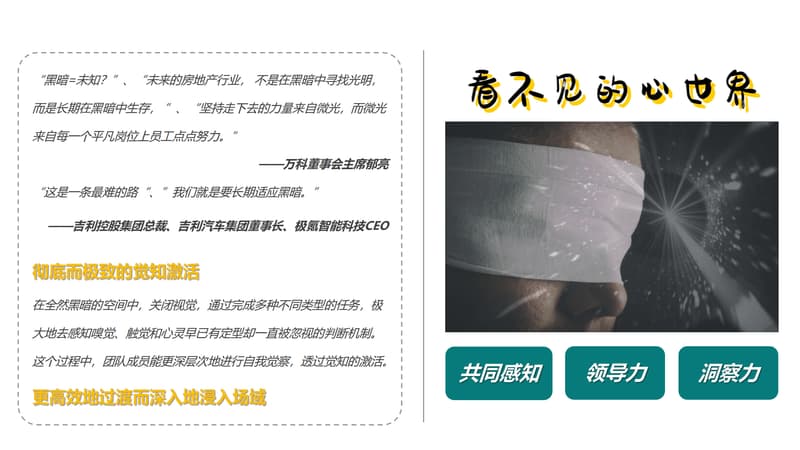 在全然黑暗的空间中,关闭视觉,通过完成多种不同类型的任务,极大地去感知嗅觉、触觉和心灵早已有定型却一直被忽视的判断机制。这个过程中,团队成员能更深层次地进行自我觉察,透过觉知的激活。