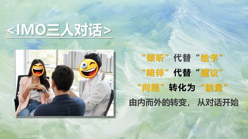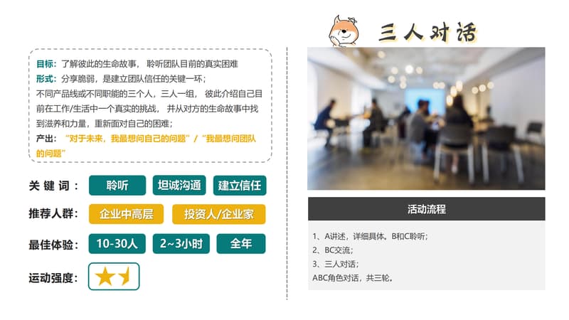 不同产品线或不同职能的三个人,三人一组, 彼此介绍自己目前在工作/生活中一个真实的挑战, 并从对方的生命故事中找到滋养和力量,重新面对自己的困难。