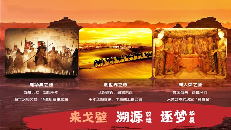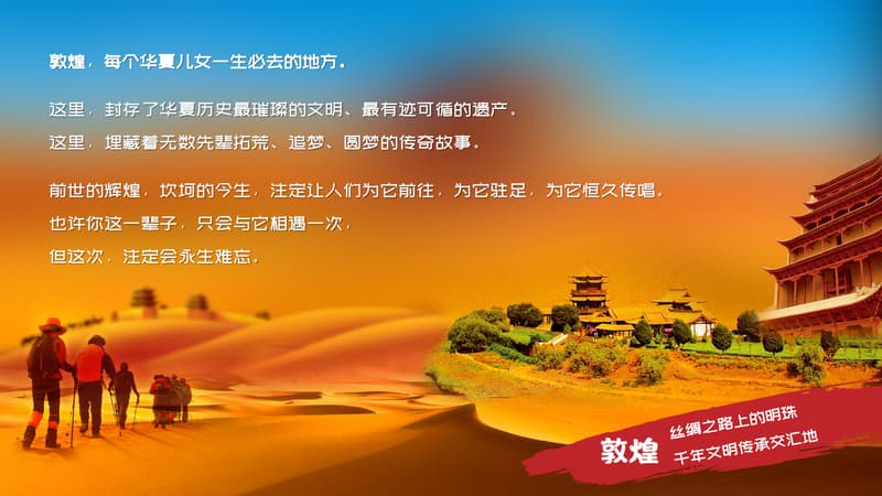 敦煌,:每个华夏儿女一生必去的地方,这里,封存了华夏历史最璀璨的文明、最有迹可循的遗产这里,埋藏着无数先辈拓荒、追梦、圆梦的传奇故事;前世的辉煌,坎坷的今生,注定让人们为它前往,为它驻足,为它恒久传唱也许你这一辈子,只会与它相遇一次但这次,注定会永生难忘。
