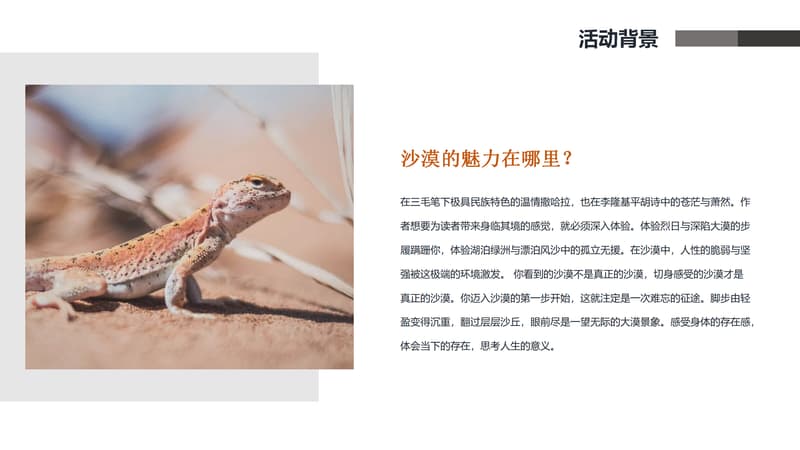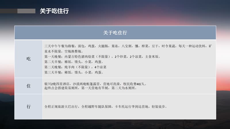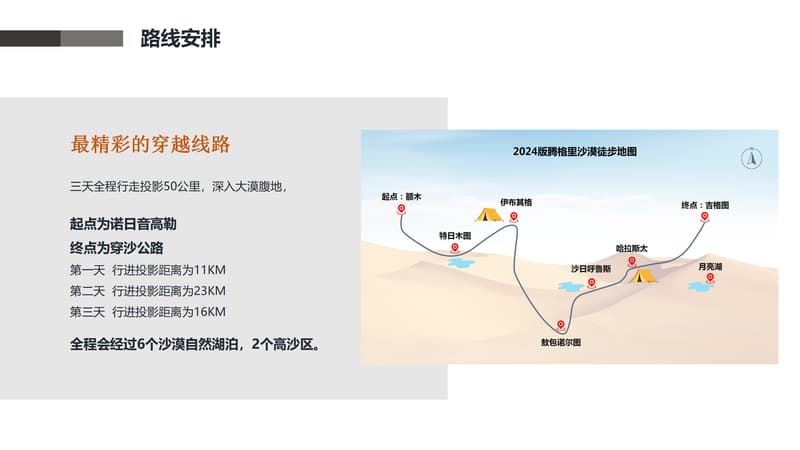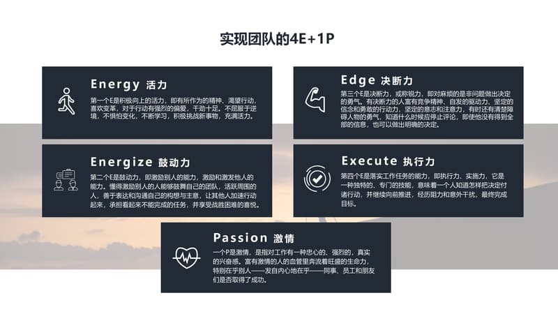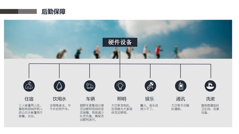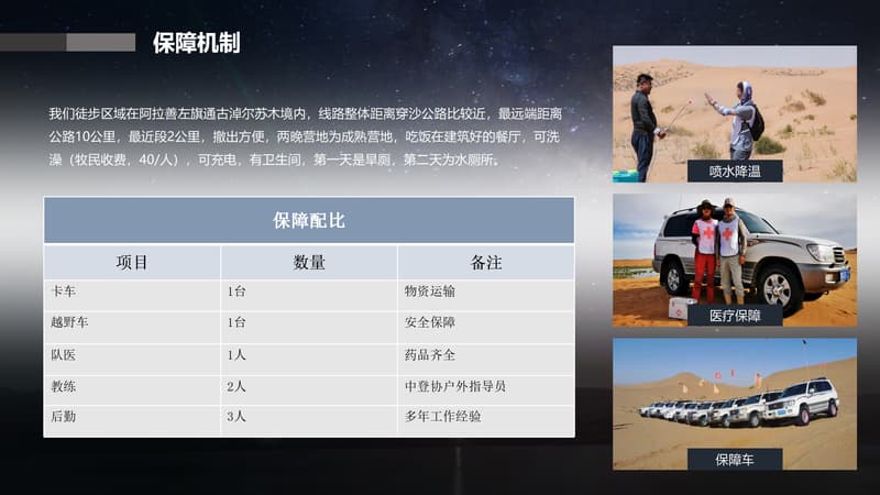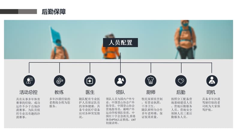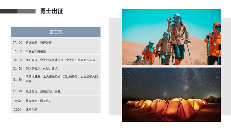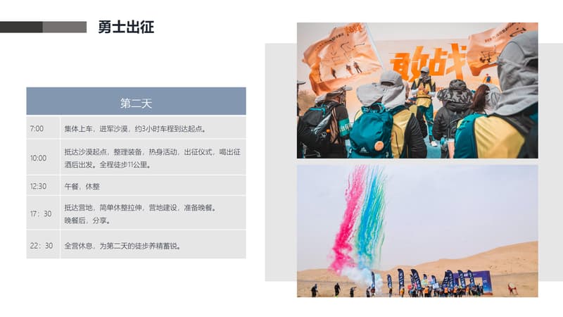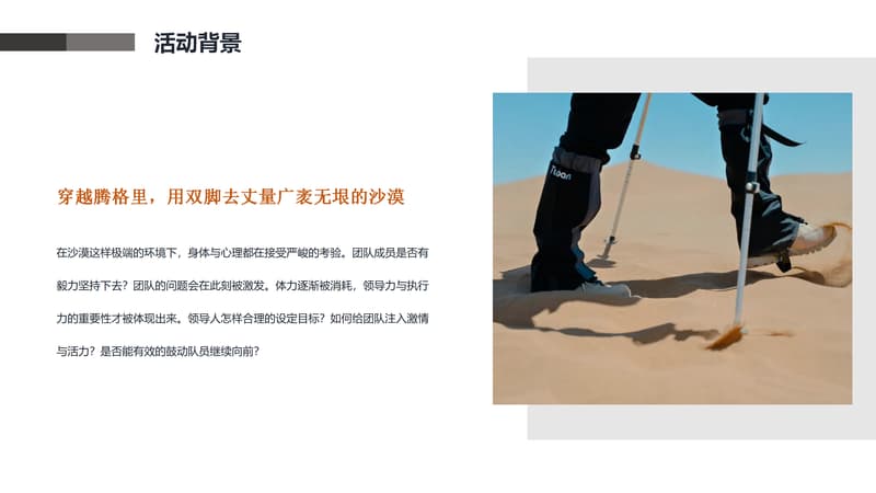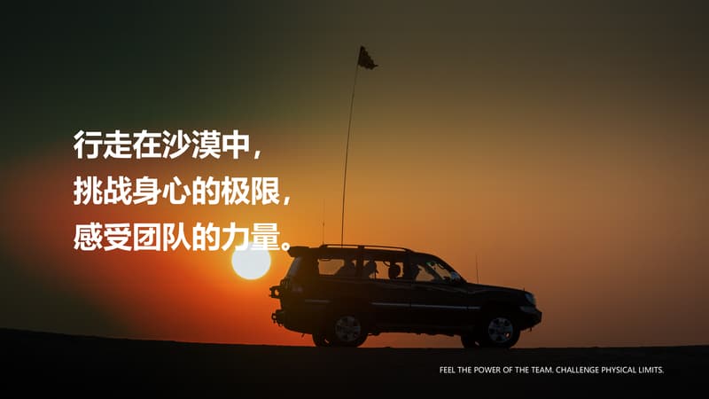 在沙漠这样极端的环境下,身体与心理都在接受严峻的考验。团队成员是否有毅力坚持下去?团队的问题会在此刻被激发。体力逐渐被消耗,领导力与执行力的重要性才被体现出来。领导人怎样合理的设定目标?如何给团队注入激情与活力?是否能有效的鼓动队员继续向前?