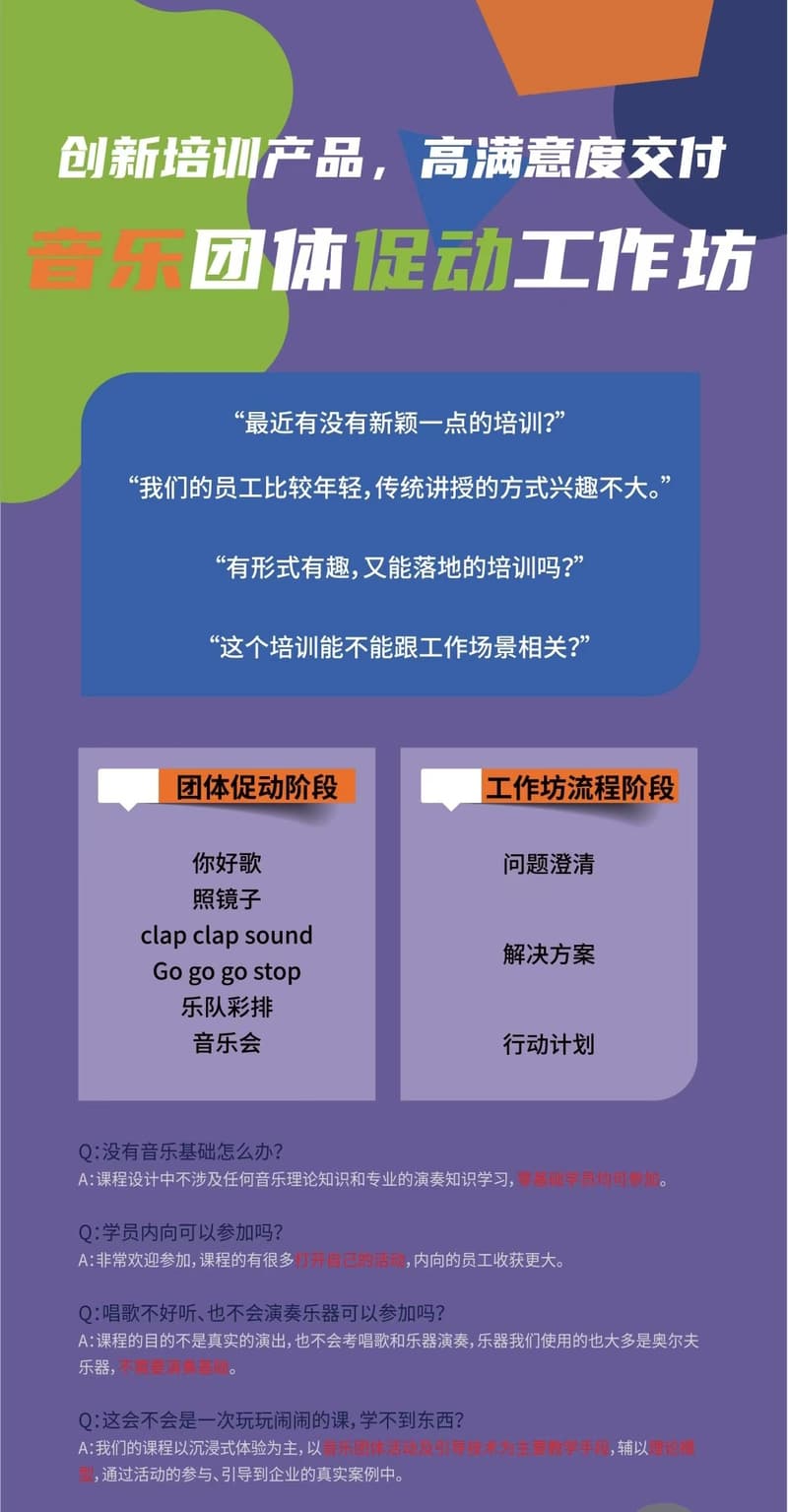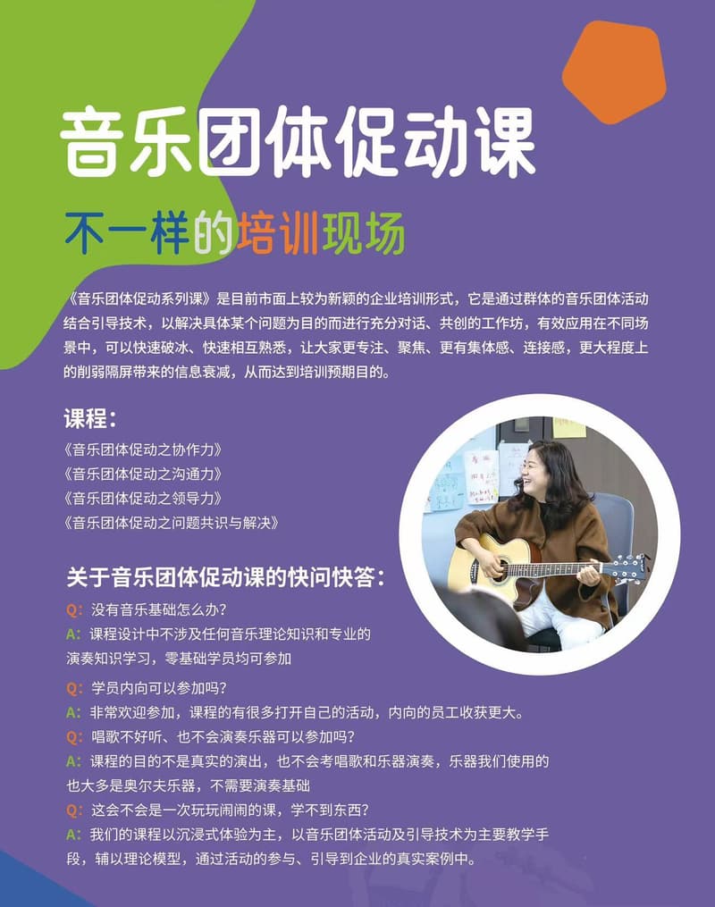 《音乐团体促动系列课》是目前市面上较为新颖的企业培训形式,它是通过群体的音乐团体活动结合引导技术,以解决具体某个问题为目的而进行充分对话、共创的工作坊,有效应用在不同场景中,可以快速破冰、快速相互熟悉,让大家更专注、聚焦、更有集体感、连接感,更大程度上的削弱隔屏带来的信息衰减,从而达到培训预期目的。
